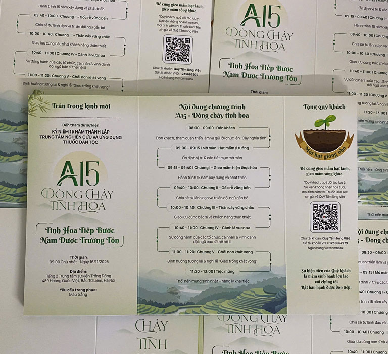 Lão cầm trên tay những tấm thiệp đầu tiên chuẩn bị gửi đi cho dịp kỷ niệm 15 năm thành lập Trung tâm Thuốc Dân Tộc – mà lòng bồi hồi không sao tả nổi. Nhìn từng dòng chữ in, từng hạt giống nhỏ xíu đính kèm, Lão không coi đây là thiệp mời đơn thuần – mà là tấm chân tình, là lời hẹn gặp của chặng đường 15 năm vun trồng tinh hoa Y học cổ truyền.